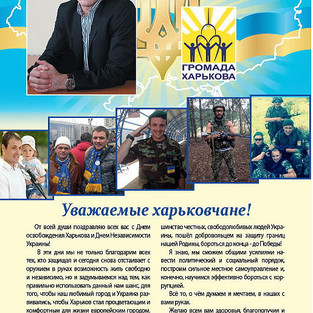 Голова ГО" Громада Харкова " привітав у друкованих ЗМІ" З Днем визволення Харкова та Днем Незалежності України.У цей важкий час для країни,я як доброволець та голова громадської організації, дякую добровольцям та волонтерам які допомагають країні і моїй організації сприяти для допомоги незалежності України.